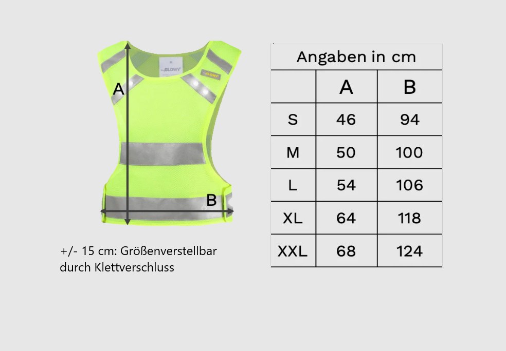 Im Winter kann die Sporweste auch über einer dicken Jacke getragen werden. Die Größen sind unisex, wobei die nebenstehende Maßtabelle anzeigt wie sich die einzelnen Größen der Weste in Zentimetern unterscheiden.